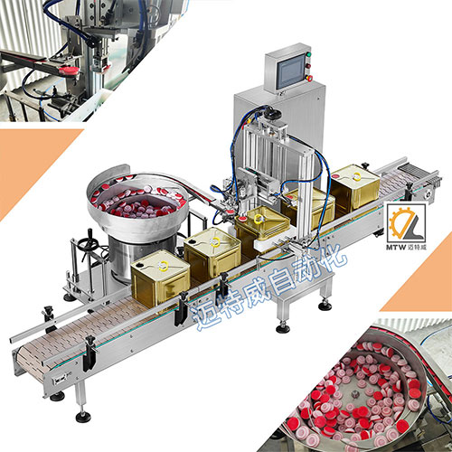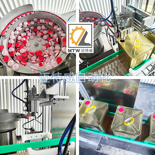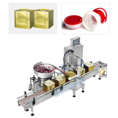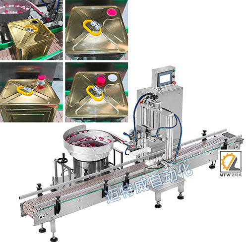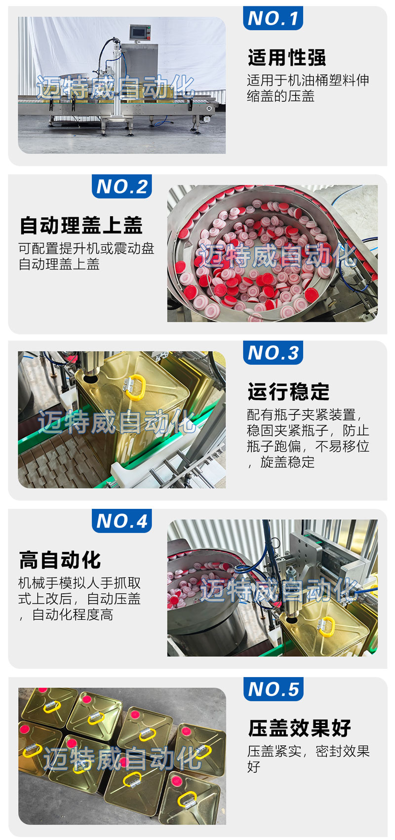 此款壓蓋機(jī)適用于機(jī)油桶塑料伸縮蓋的壓蓋。使用振動盤將瓶蓋送入瓶口,然后按下瓶蓋,將瓶蓋和瓶子緊緊密封。