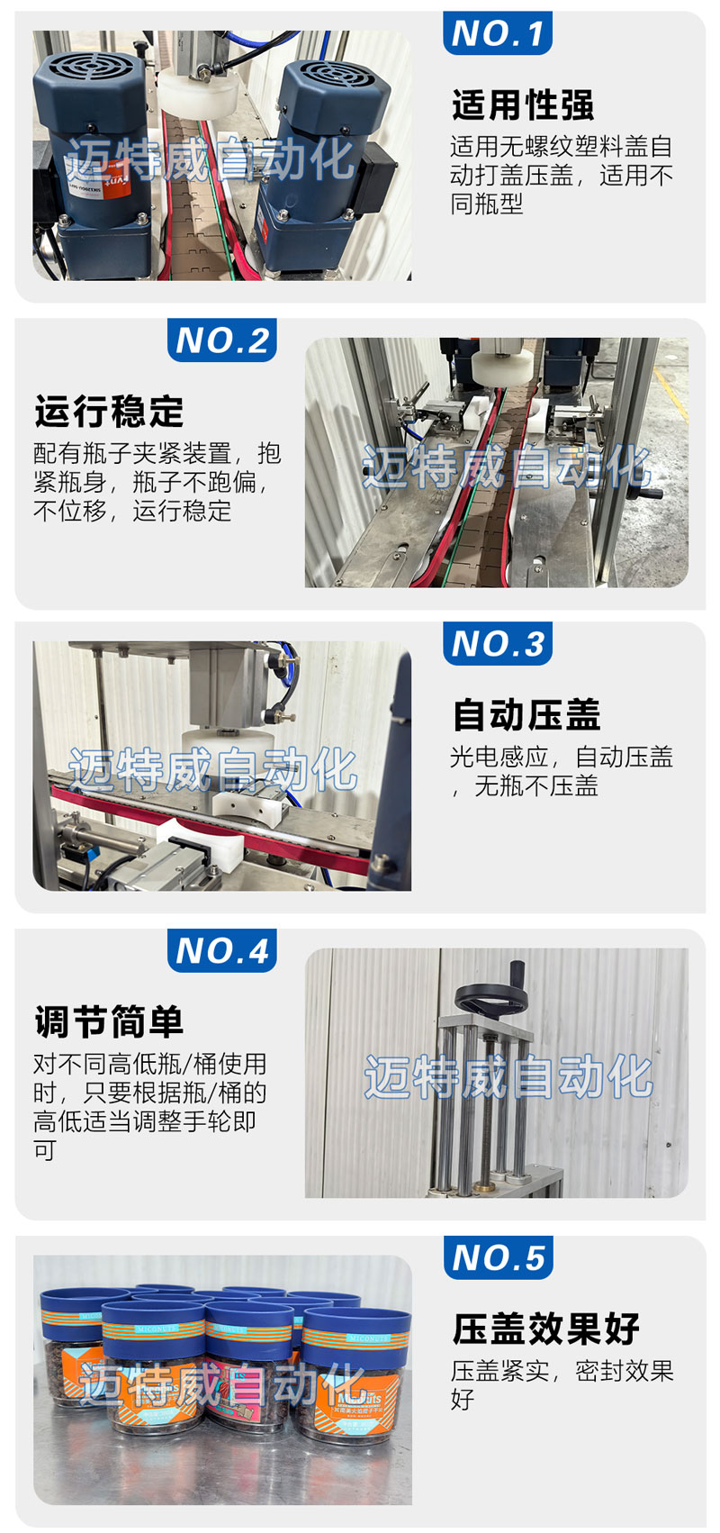 本機適用于各種無螺紋塑料蓋自動打蓋壓蓋,使用范圍廣、點地面積小,與灌裝機、上蓋機、裝箱機等聯機使用,完成后道包裝生產線。