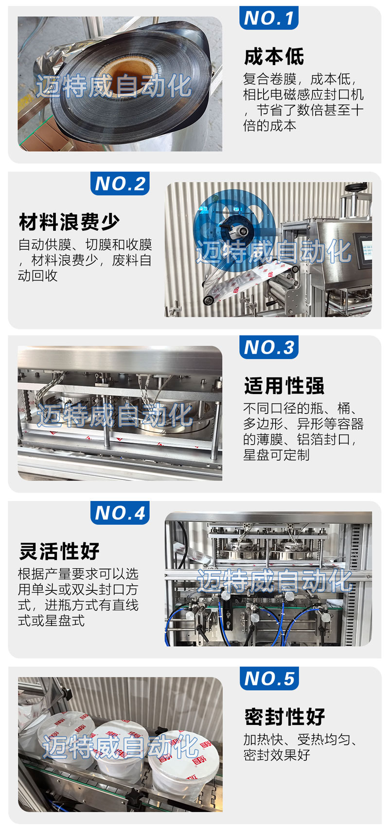 直線式卷膜鋁箔封口機適用于各種塑料、玻璃、陶瓷、金屬等各種圓形、方形、多邊形、異形等容器瓶口的鋁箔熱封口。
