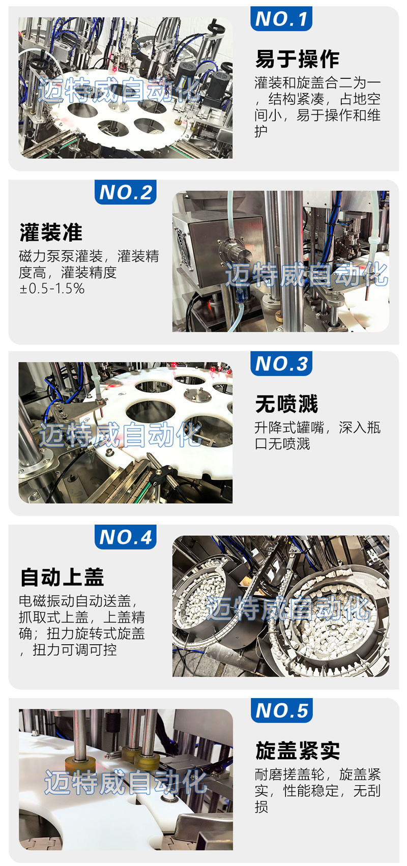 ● 采用高精度磁力泵泵定量灌裝,電磁振動(dòng)自動(dòng)送蓋,伺服驅(qū)動(dòng)旋蓋,具有無(wú)瓶不灌裝的功能;