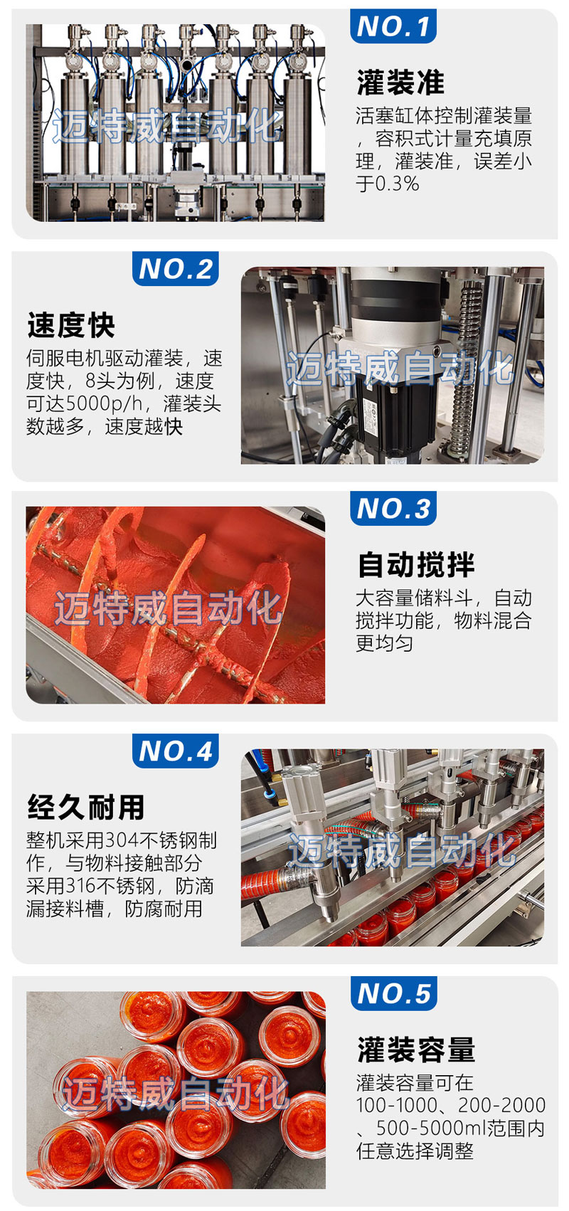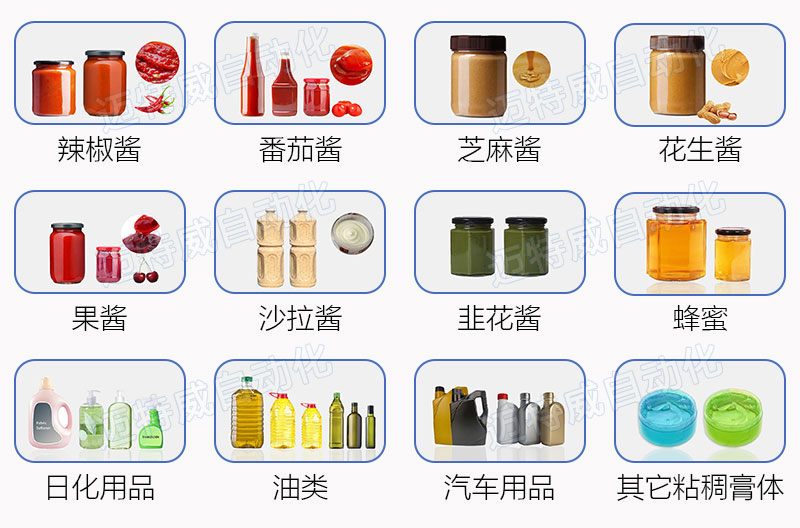 應用行業: 如辣椒醬,芝麻醬,番茄醬,沙拉醬,果醬,花生醬,寵物醬料,蒜泥,韭花醬,蟹黃醬,調味料等粘稠醬類灌裝。