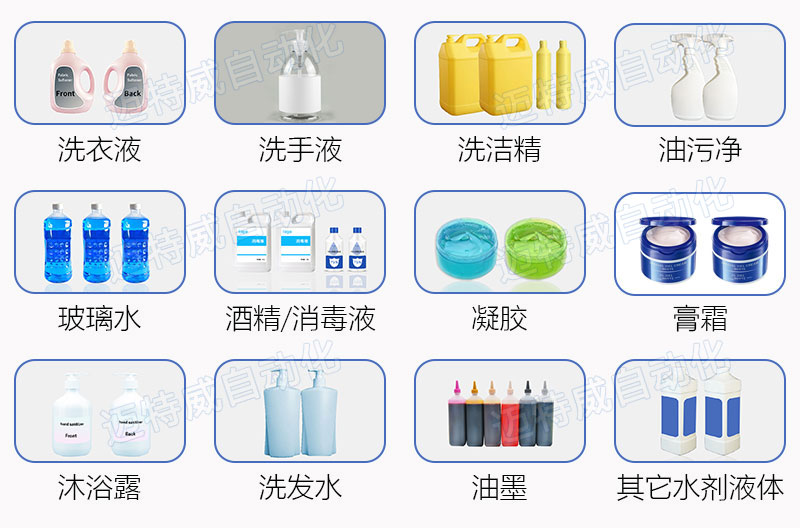 應用范圍:洗衣液/洗潔精灌裝機適用于各種膏霜、啫喱、凝膠類等日化產(chǎn)品自動灌裝, 如洗衣液,洗手液,化妝品,洗潔精,油污凈,洗滌劑,清潔劑,洗發(fā)水,沐浴露,精華液,面霜,化妝品等。