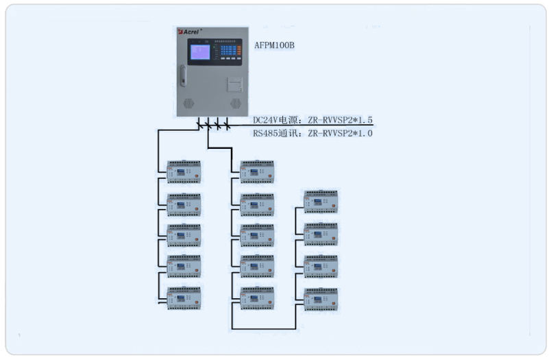 本項目承接其消防設備電源監(jiān)控系統(tǒng),通過對其樓層分布的20塊AFPM3-2AV型消防電源監(jiān)控模塊的數據采集,完成在AFPM100主機的電壓狀態(tài)數據的實時顯示、報警。
